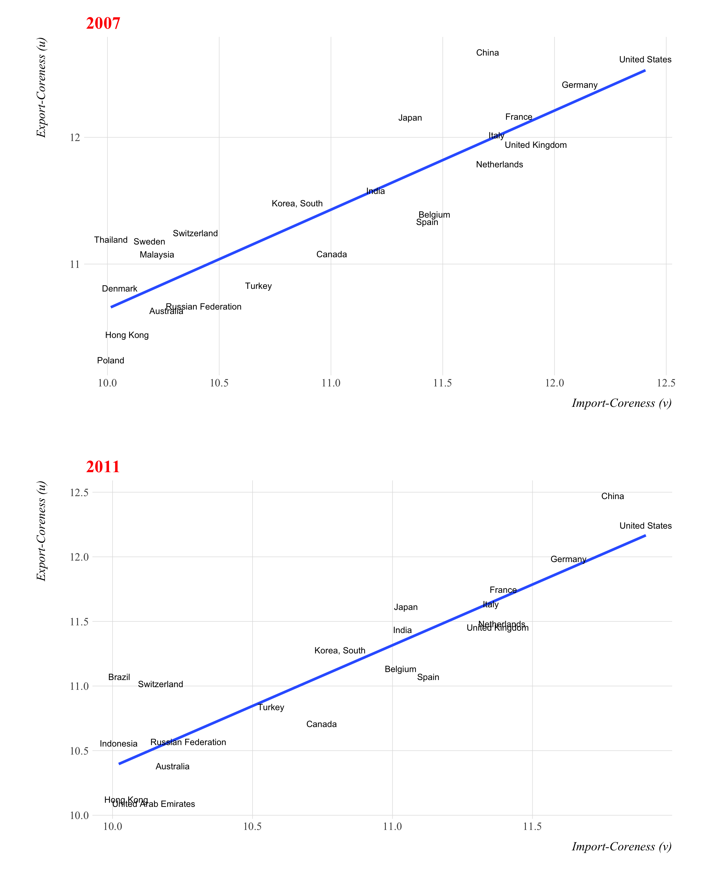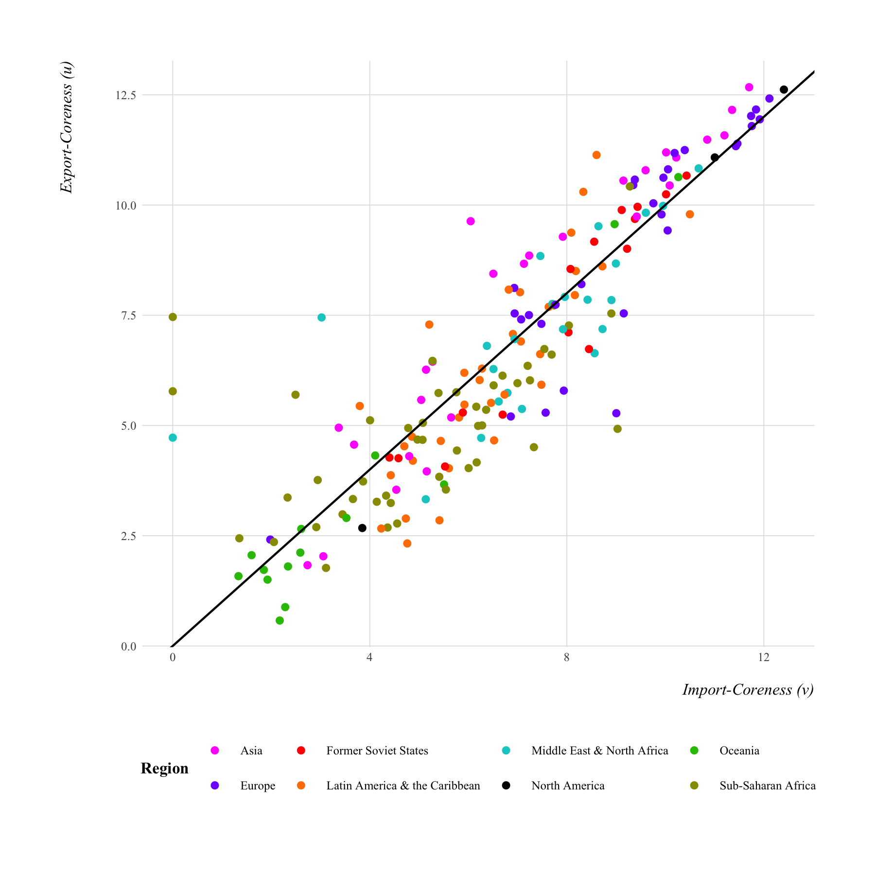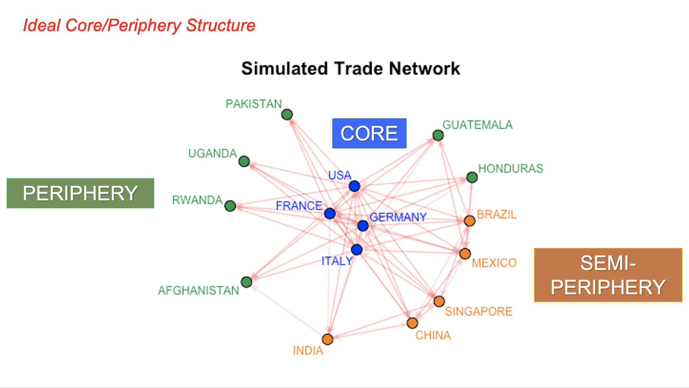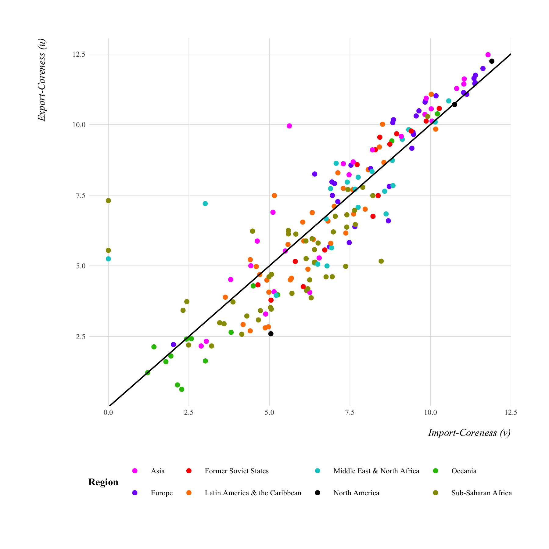 The late 20th-century wave of globalization has configured a global international division of labor, forming a core-periphery structure. In social network analysis, this core-periphery structure signifies a network with two distinct components: a densely connected ‘core’ of actors and a sparser ‘periphery.’ The peripheral actors are closely linked to the core but loosely connected among themselves. Regarding global trade, the core nations are highly interconnected within the global economic system, engaging extensively with most other nation-states. In contrast, peripheral nations are less interconnected, relying predominantly on their economic ties with the core countries for their economic activities.